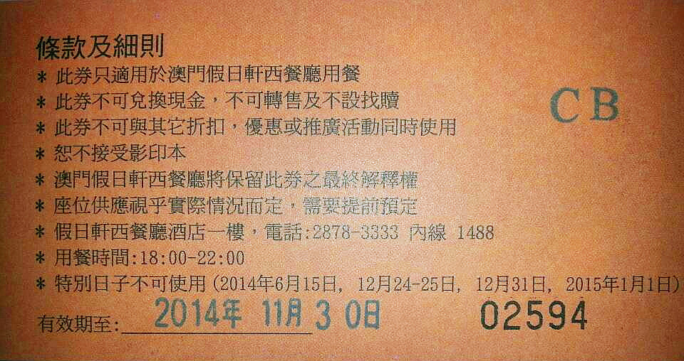 澳門假日酒店假日軒自助晚餐券(現票)