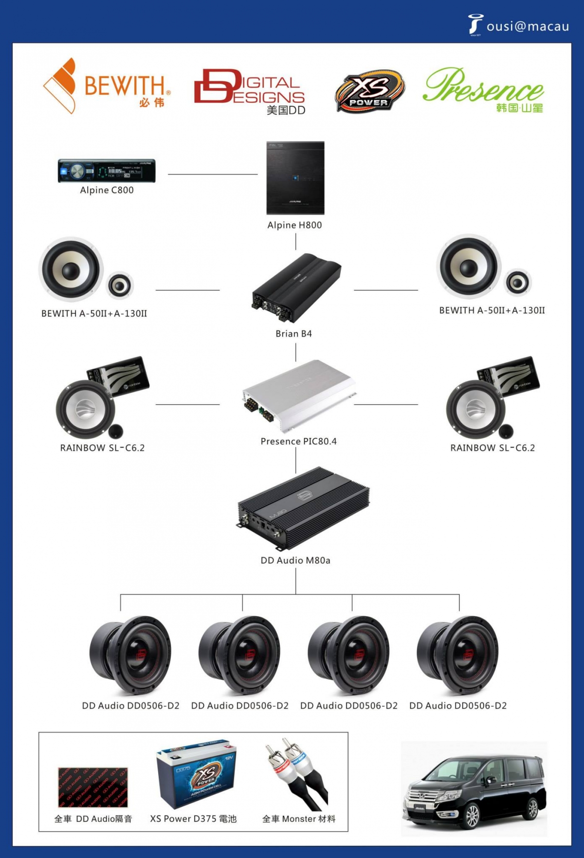 前喇叭:日本 BEWITH A50II高音 + A130II中音(主動式)